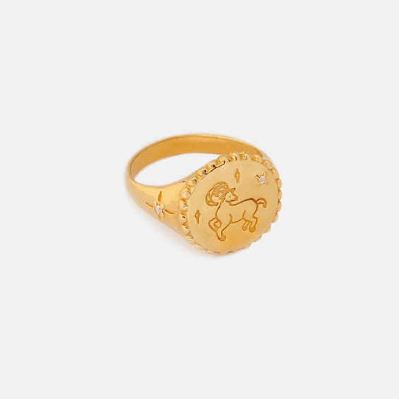 Our wax-carved Astrologia signet ring illustrated by New York based artist, Comfortable Fields. Made from gold vermeil and zircon.