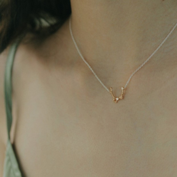 Our wax-carved Astrologia necklace made from gold vermeil and zircon.